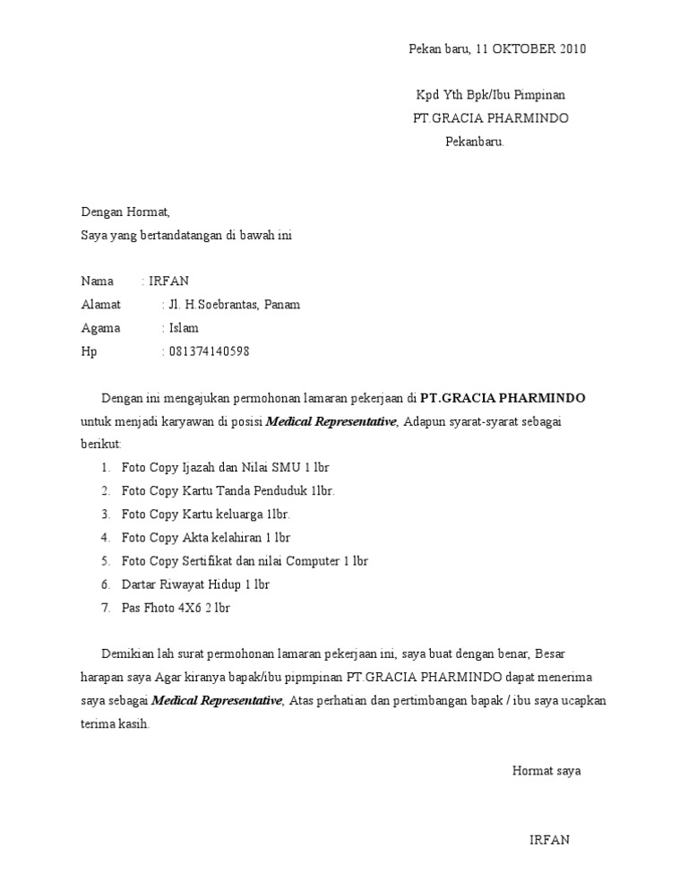 Surat lamaran kerja merupakan salah satu surat resmi dari pelamar kerja ke instansi/perusahaan yang berisi permohonan untuk mendapatkan pekerjaan sesuai dengan lowongan kerja yang sudah. Contoh surat lamaran kerja yang baik dan benar. Surat lamaran merupakan surat permohonan yang dibuat oleh para pelamar pekerjaan atau pencari kerja, kemudian dikirimkan terhadap suatu badan usaha maupun instansi untuk mendapat pekerjaan. Contoh surat lamaran kerja yang baik dan benar untuk melamar pekerjaan di berbagai instansi baik bumn maupun swasta lengkap dengan file.doc siap untuk didownload dan diprint out/cetak. Contoh surat lamaran kerja yang baik dan benar untuk dijadikan referensi dalam usaha mencari kerja di sebuah perusahaan sesuai dengan keahlian kamu.